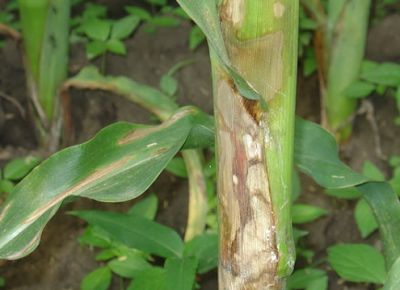 流行規(guī)律 紋枯病菌,屬擔(dān)子菌類,絲核菌屬。以遺留在土壤中和病株殘?bào)w上的菌核和菌絲越冬,次年產(chǎn)生菌絲和擔(dān)孢子,成為初次侵染原。菌絲、擔(dān)孢子和孢子,借風(fēng)力和氣流傳播,也可通過與病部接觸而造成再次侵染、擴(kuò)大危害。發(fā)病輕重,主要受菌源量、菌源致病力和田間溫濕度的制約。菌源量大、致病力強(qiáng),田間溫度高、濕度大,發(fā)病較重,溫度低于20℃,相對(duì)濕度小于75%時(shí), 不利于菌絲生長,致病力弱,發(fā)病較輕。不同玉米品種,感染紋枯病的程度雖有一定差異,但目前尚未發(fā)現(xiàn)抗病品種。對(duì)此,尚待深入研究。