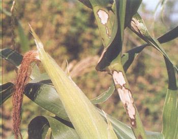 癥狀 紋枯病(俗稱"花腳稈","爛稈瘟")是近年來發(fā)生危害日益嚴(yán)重的一種新病害。四川省各地均有發(fā)生,以高溫、高濕條件下和夏播玉米發(fā)病較嚴(yán)重。其寄主甚廣,除危害玉米外,還可侵染水稻、小麥、大麥、高粱、棉花、大豆等多種作物。該病主要危害葉鞘,也可侵染葉片、苞葉和果穗,玉米拔節(jié)至成熟期均可發(fā)病。開始從莖基部的葉鞘感病,后侵染葉片并向植株上部蔓延。發(fā)病初期,光出現(xiàn)水漬狀灰綠色圓形或橢圓形病斑,后轉(zhuǎn)為白色至淡 黃色,發(fā)病后期,變?yōu)榧t褐色云紋狀斑 塊。當(dāng)濕度較大時(shí),病斑上常長出許多白霉(菌絲和擔(dān)孢子);當(dāng)溫度較高或植株已老健不適合病菌擴(kuò)大危害時(shí),即產(chǎn)生菌核,多藏于葉鞘內(nèi)。菌核初為白色,老熟時(shí)呈褐色。葉鞘受害后,葉片萎蔫,嚴(yán)重時(shí)整株枯死,果穗受害后,可使苞葉干枯,果穗腐爛。